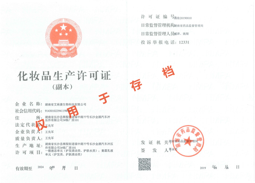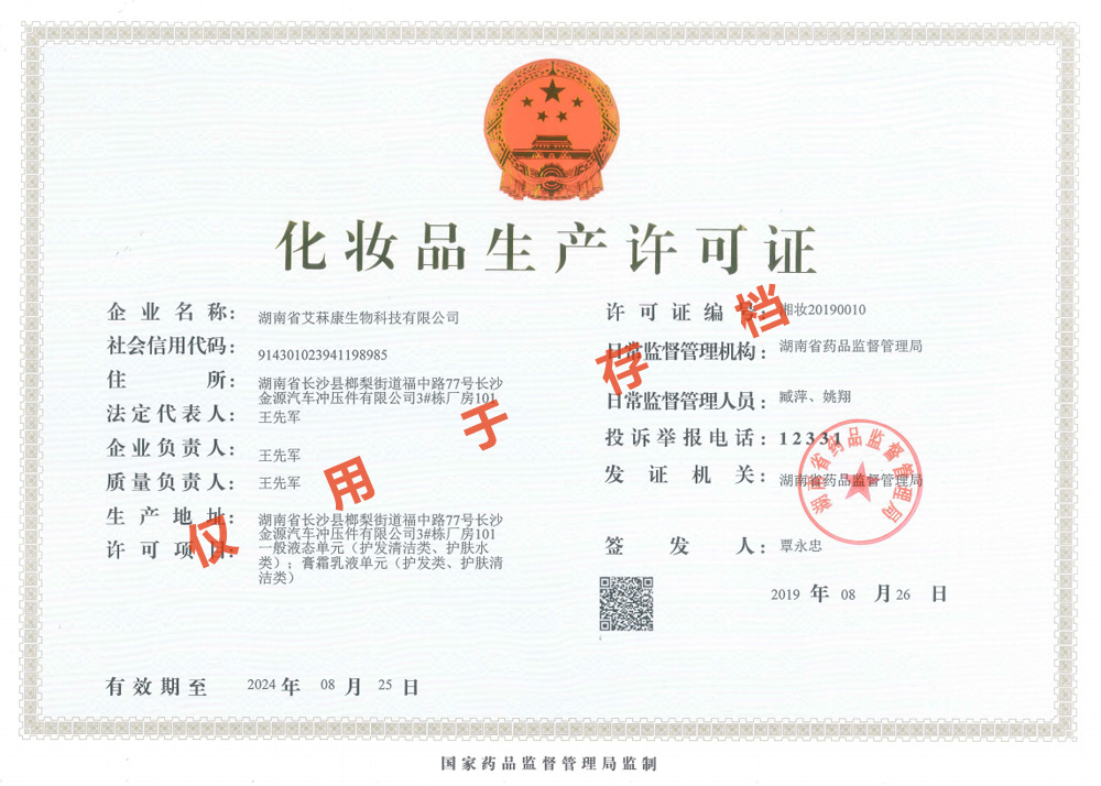 多項專利發(fā)明人王先軍 手機:150-7483-5702 手機:195-7316-0288經(jīng)食藥監(jiān)局領(lǐng)導(dǎo)專家們層層審核并一致通過,富達艾菻康公司正式獲得了化妝品生產(chǎn)許可證。消息傳來,公司全體員工群情激奮,熱烈歡呼。此次順利通過現(xiàn)場驗收并取得化妝品生產(chǎn)許可證,標(biāo)志著公司已完全具備了生產(chǎn)和銷售一般液態(tài)單元(護發(fā)清潔類、護膚水類);膏霜乳液單元(護發(fā)類、護膚清潔類)的資質(zhì),這將成為公司進軍化妝品行業(yè)的新起點。