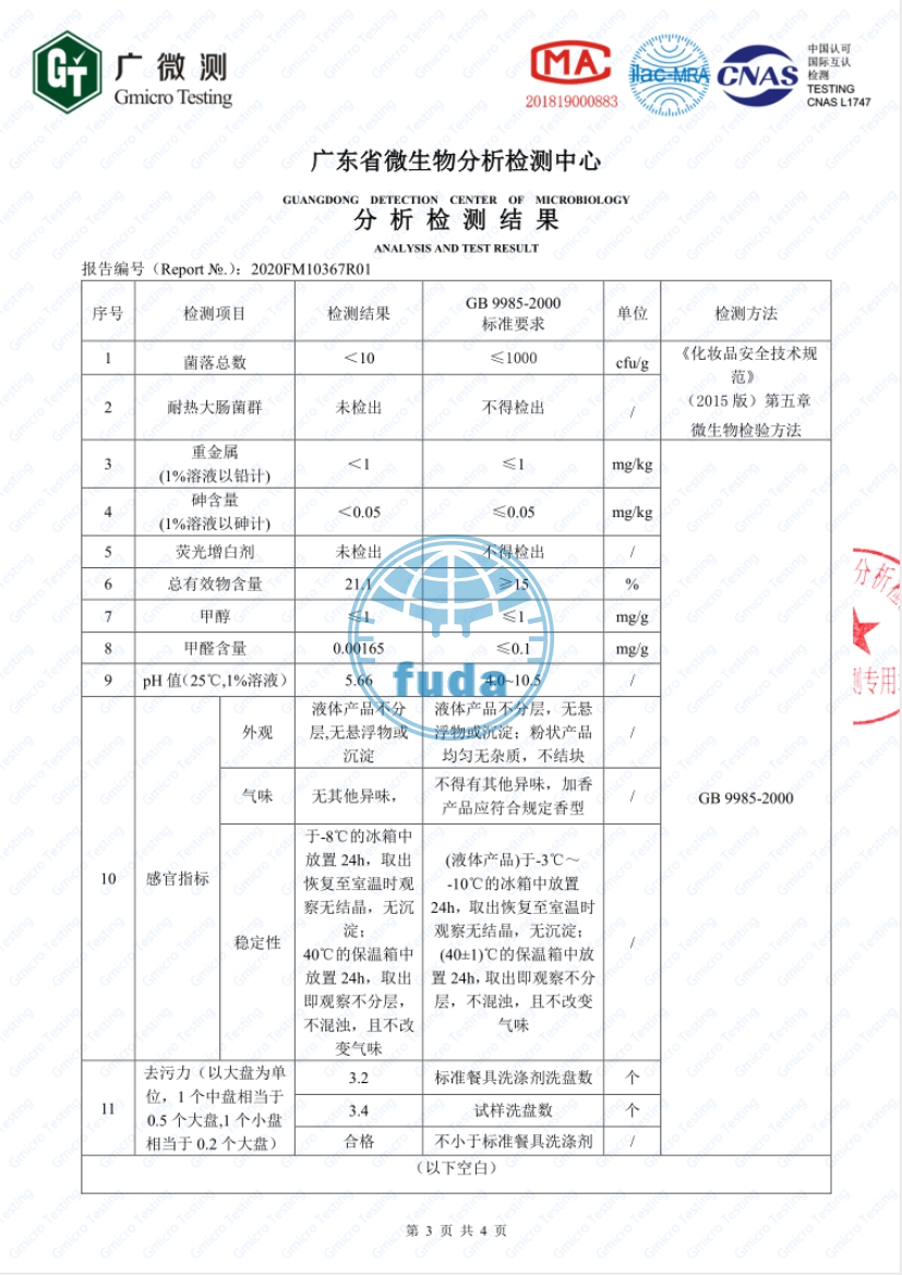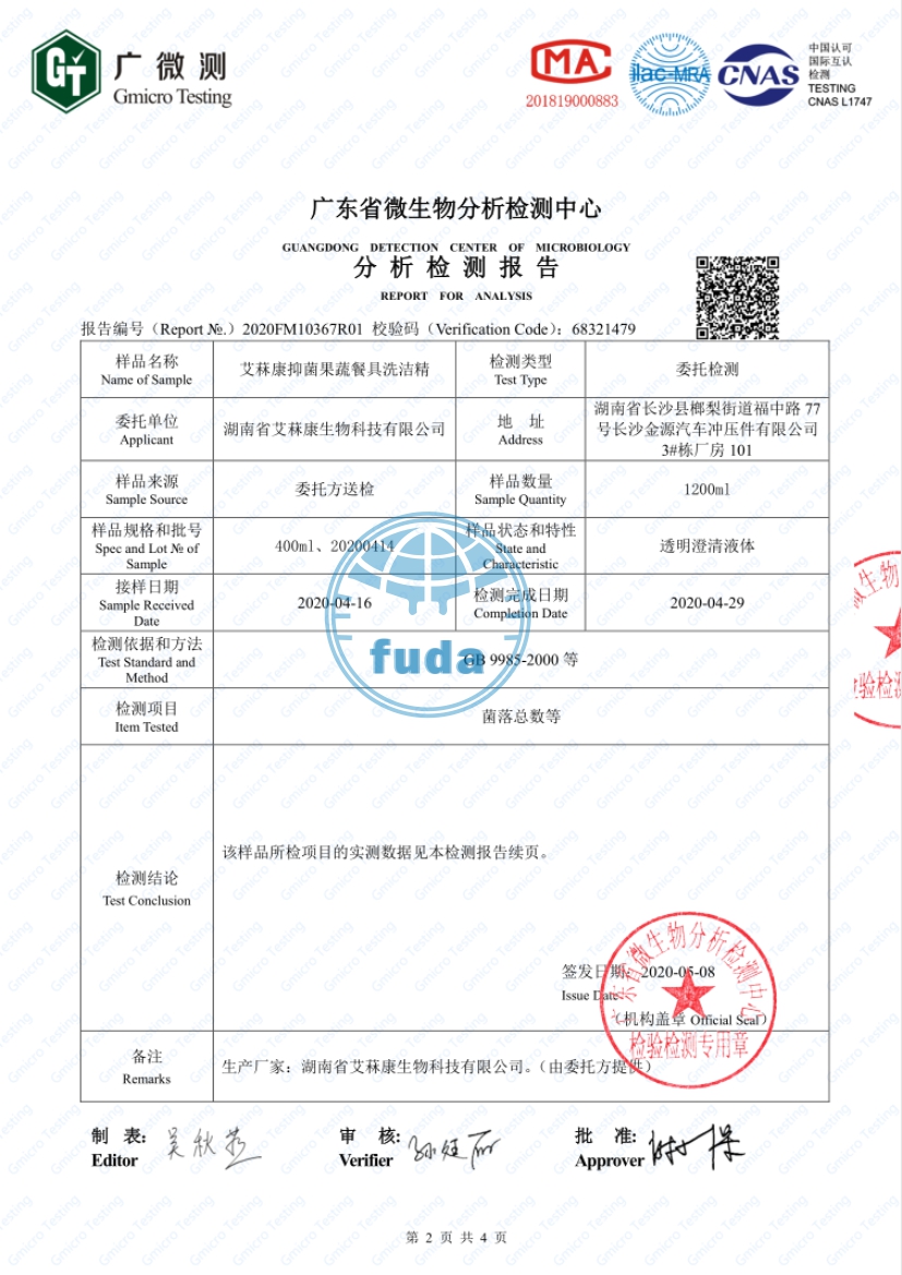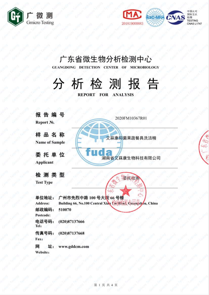 湖南省艾琳康生物科技有限公司獲得了抑菌果蔬餐具洗潔精檢測(cè)報(bào)告