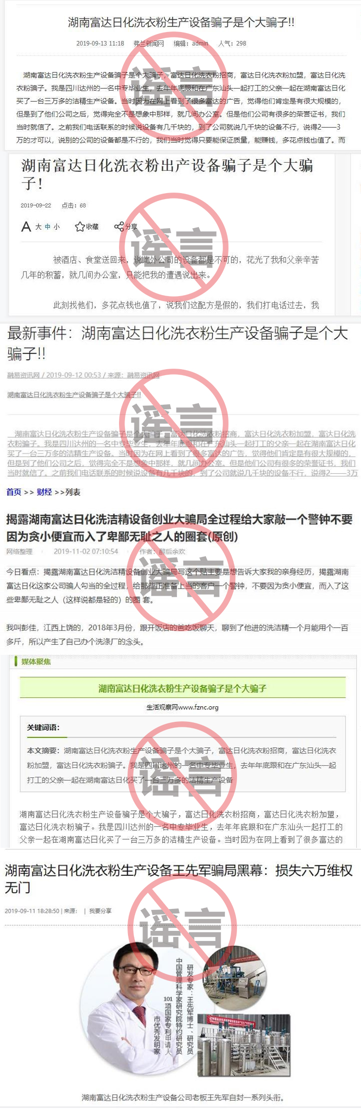 不難發(fā)現(xiàn),這些文章的主人公不一樣,但發(fā)文章的時間卻出奇的一致,都集中在2019年9月份左右。這是為什么呢?這些同行之所以惡意誹謗富達(dá)日化,是因為湖南富達(dá)日化發(fā)起的中國創(chuàng)業(yè)者防騙鋤騙互助沙龍微信群公開揭露了北京武漢等地的偽劣洗潔精設(shè)備和偽劣洗衣液設(shè)備及偽劣車用尿素設(shè)備,達(dá)到打擊報復(fù)惡意誹謗富達(dá)日化的目的。眾所周知,富達(dá)日化成立30多年,創(chuàng)始人王先軍是一百多項專利的發(fā)明人,他的所有產(chǎn)品都是被國家所認(rèn)可。而當(dāng)富達(dá)日化的創(chuàng)始人公開打假、公開揭露北京武漢同行偽劣洗潔精設(shè)備偽劣洗衣液設(shè)備偽劣車用尿素設(shè)備內(nèi)幕的時候,騙局制造者們狗急跳墻,試圖用捏造事實惡意攻擊湖南富達(dá)日化的行為阻止中國鋤騙防騙互助沙龍的打假行為,湖南富達(dá)日化的回答是:絕對辦不到!
