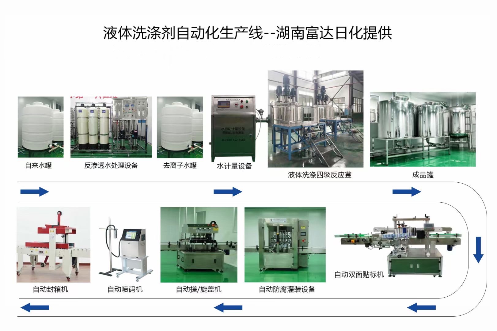 包含以下部分:專用水處理設(shè)備、反應(yīng)釜(含乳化、攪拌功能)、定量灌裝機(jī)、旋蓋機(jī)、專用印碼器、封箱機(jī)等。富達(dá)日化為您詳細(xì)介紹各設(shè)備的功能和具體用途。