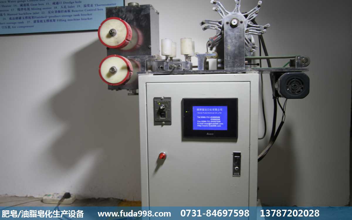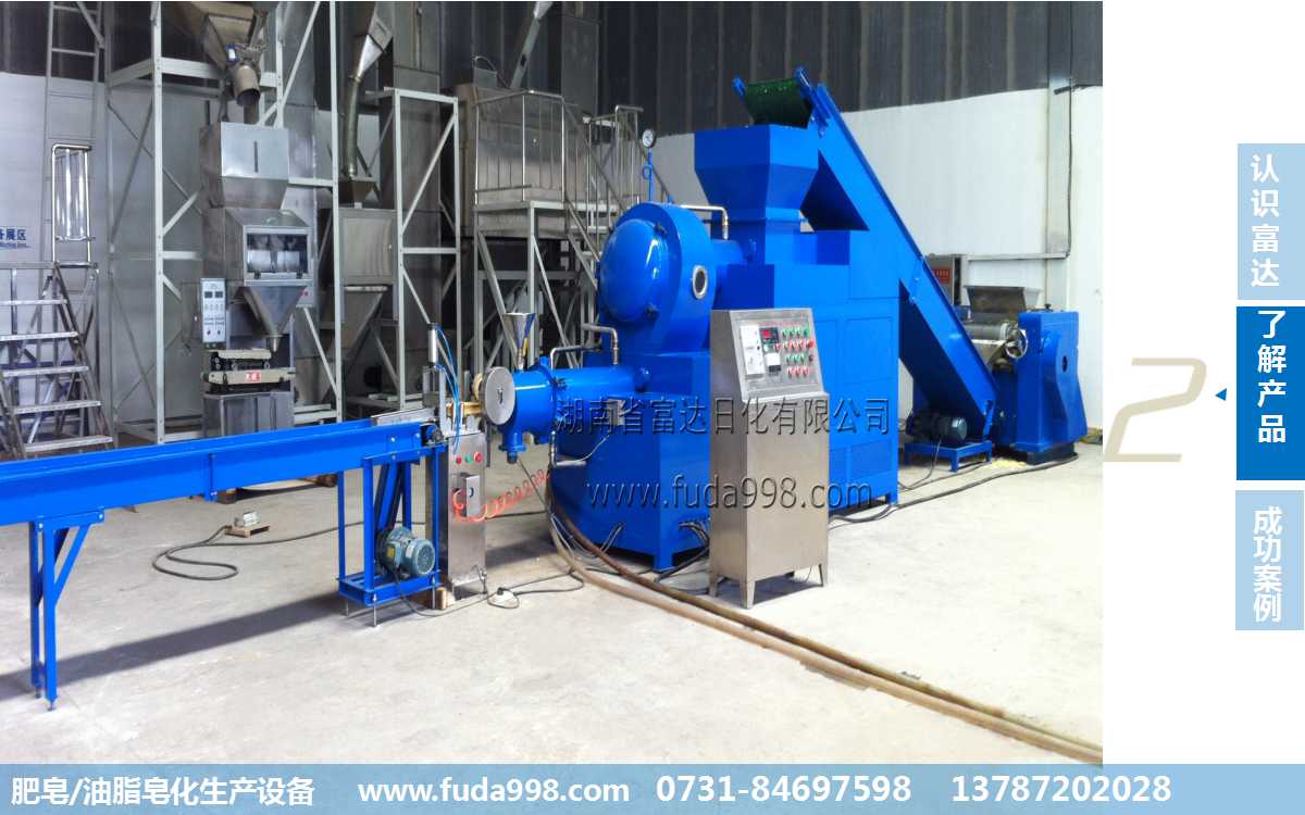(2)用半成品皂泥:通過(guò)從大廠購(gòu)買皂粒(皂泥),采用FZ-1000肥皂生產(chǎn)線,主要有三棍研磨機(jī)、半成品輸送機(jī)、雙螺旋真空抽條機(jī)、真空泵、肥皂滾印切塊機(jī)等設(shè)備組件構(gòu)成,通壓條,切塊,打印,包裝,最后生產(chǎn)出合格的肥皂。