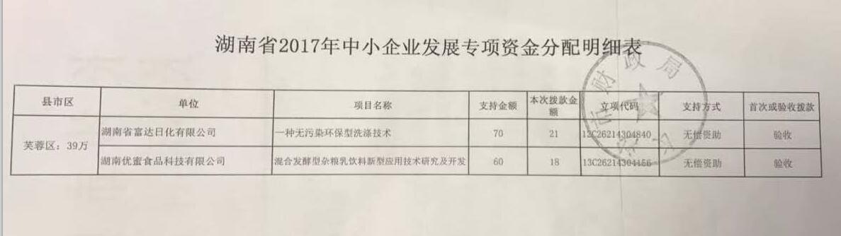 多項專利發(fā)明人王先軍 手機:150-7483-5702 手機:195-7316-02882017年7月26日,根據(jù)湖南省財政廳關(guān)于下達2017年中央財政中小企業(yè)發(fā)展專項資金的通知》(湘財教指【2017】31號),將中央財政中小企業(yè)發(fā)展專項資金予以下達。由長沙市財政局和長沙市科學技術(shù)局共同簽發(fā)文件,將相關(guān)款項如數(shù)劃撥到項目承接單位。湖南省富達日化有限公司申報的項目“ 一種無污染環(huán)保洗滌技術(shù)”由中央財政無償資助項目項目驗收款21萬元。截止2017年11月,湖南省富達日化有限公司再次獲得中央財政無償項目資金支持。